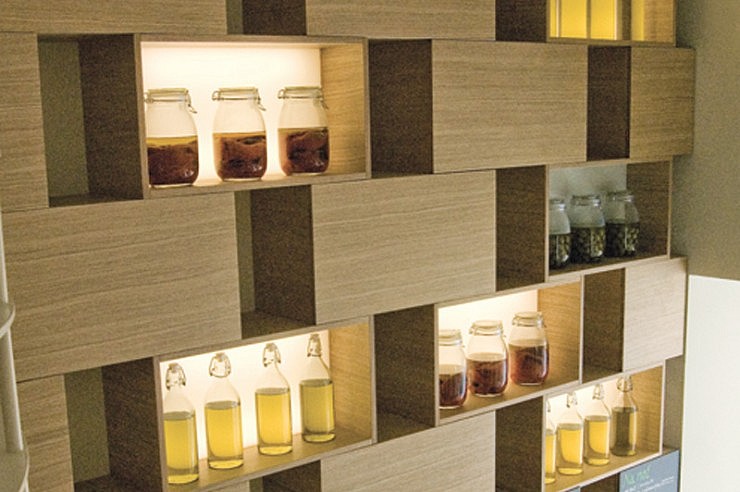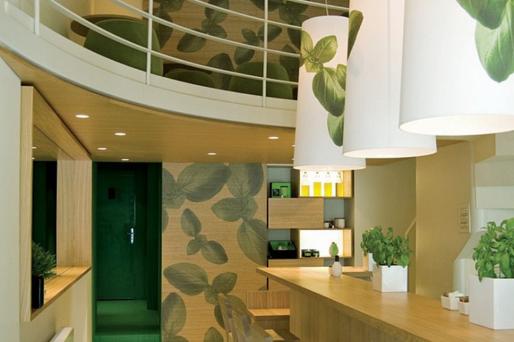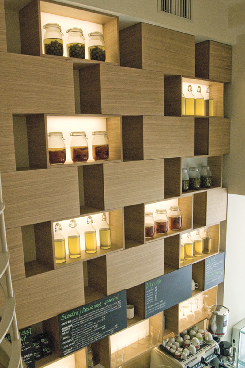 Bazillika Shop&Cafe na Miklošičevi 22, 2008 Avtorici interierja: Mojca Kocbek Vimos, Nena Gabrovec Foto: Leonardo Vimos Sierra Oblikovanje svetil: Julija Zornik Strle
