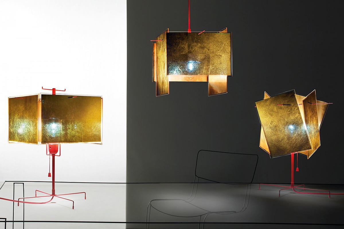 Dekorativna, igriva viseča luč nudi prijetno razpršeno svetlobo. Zlati lističi so uliti v plastične senčnike in omogočajo obešanje na palice v različnih zornih kotih in razdaljah. Na voljo tudi namizna različica.