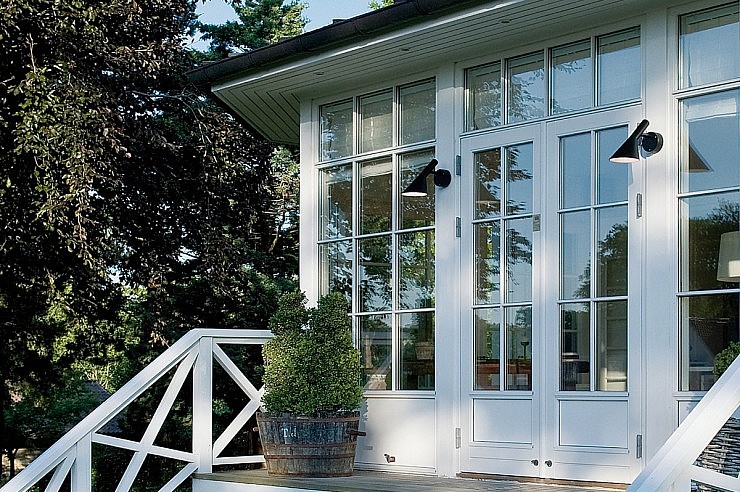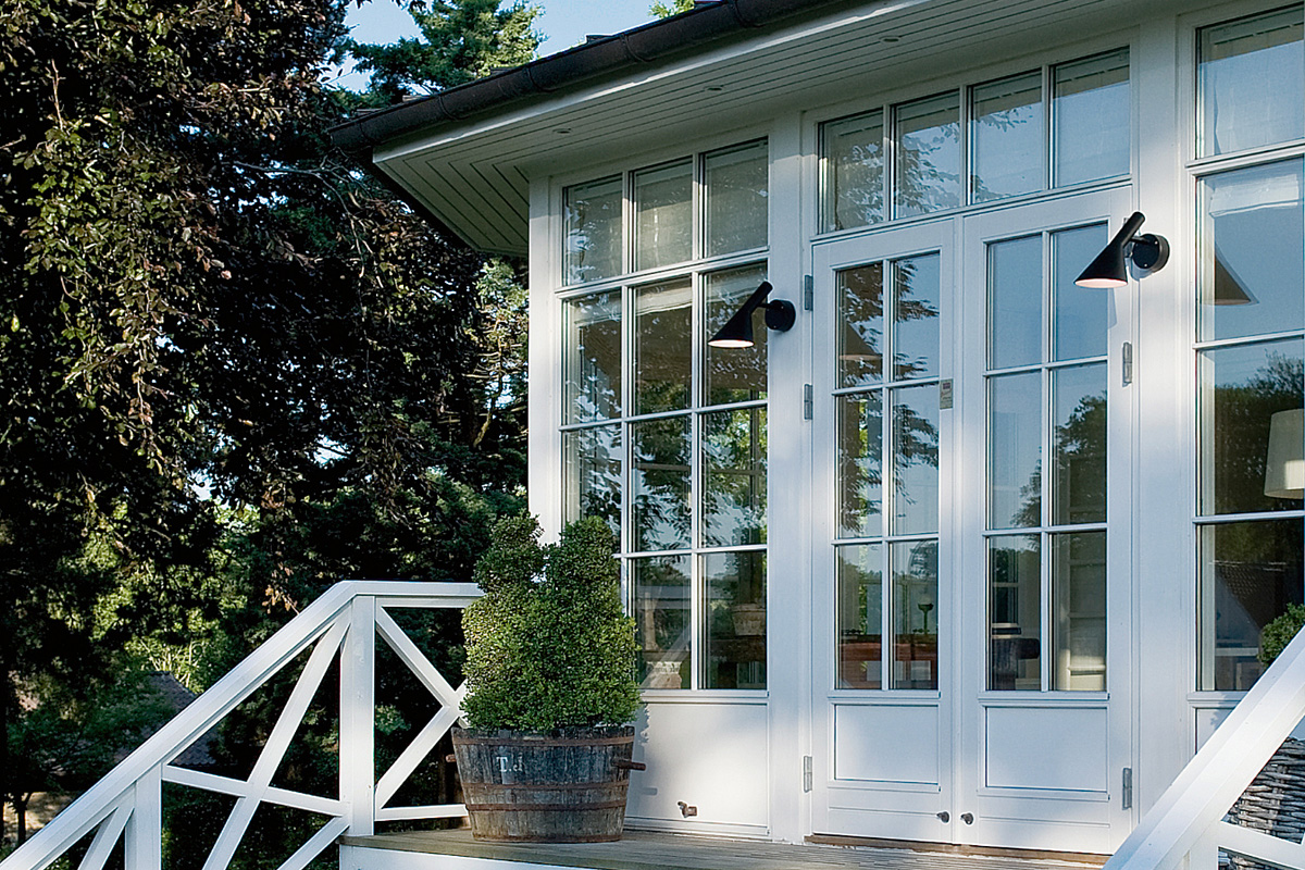 Stensko zunanje svetilo z obračujočo glavo in dekorativno svetlobo, primerno za osvetlitev vhodov. Zaščita IP65, IK06.