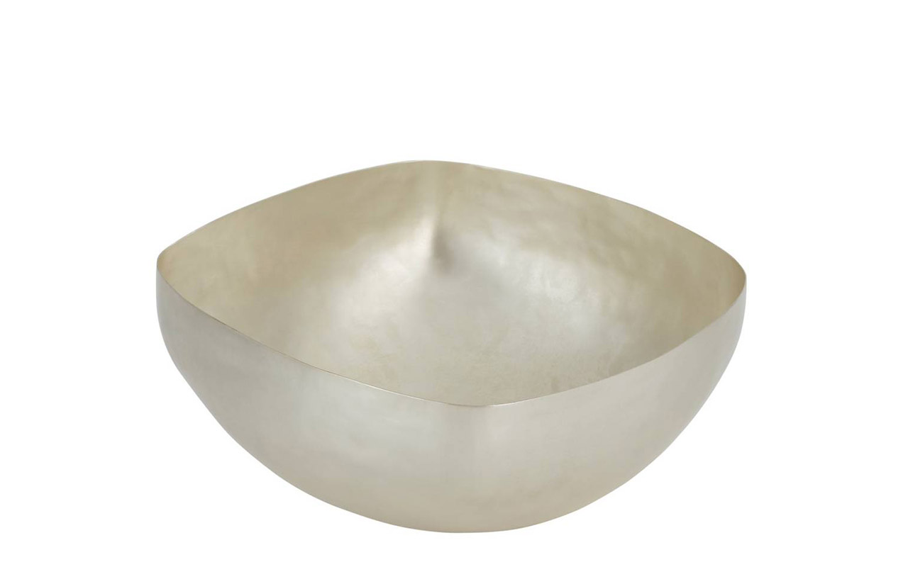 Posoda za serviranje prigrizkov iz neobdelane posrebrene medenine, 29x29x14 cm. Uporaba samo za suho hrano.