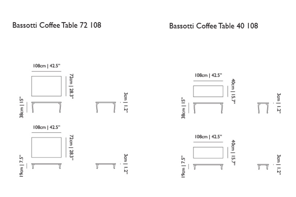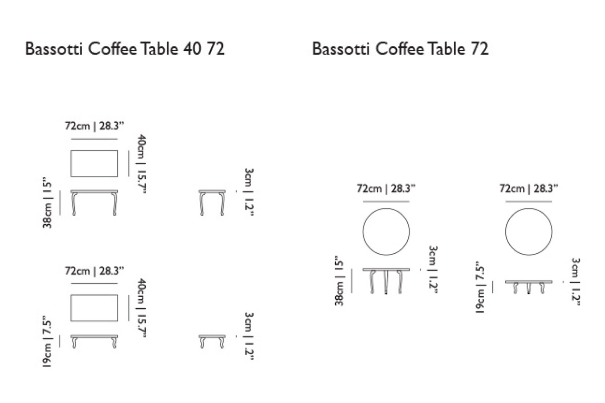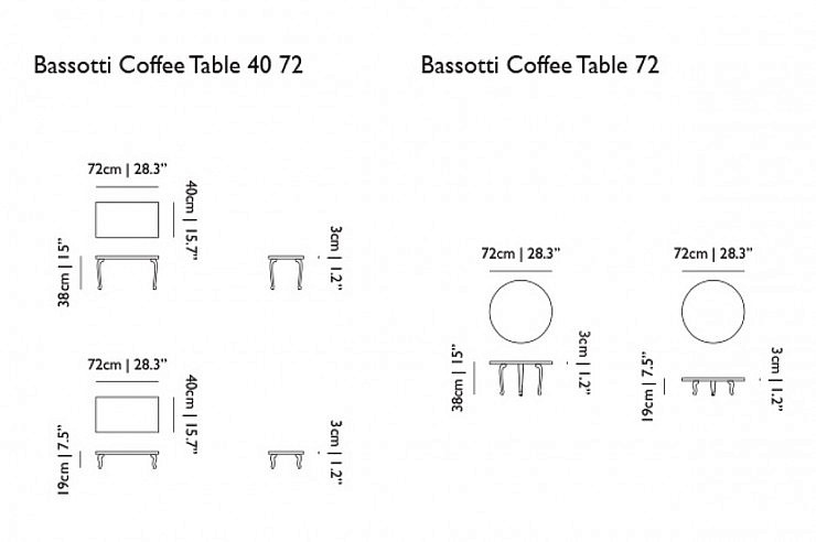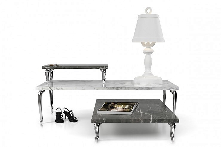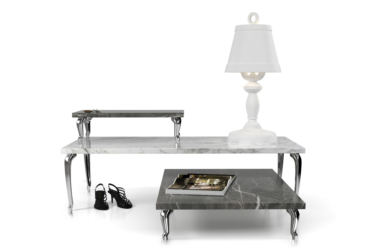 Mizica za dnevno sobo je zasnovana tako, da lahko izbirate zgornjo ploščo med sivo marmornato ploščo pietra ali belo carraro v štirikotnih ali okroglih oblikah z dekorativnimi kromiranimi nogami.