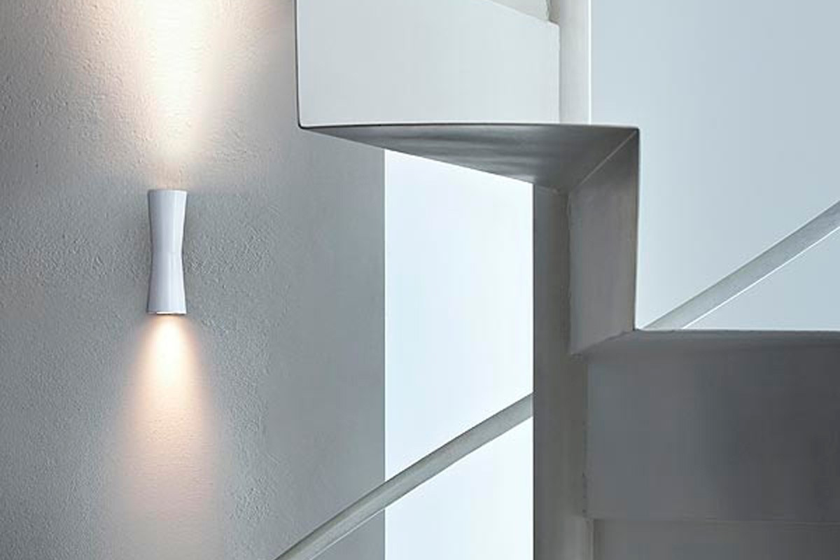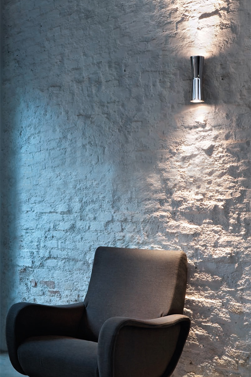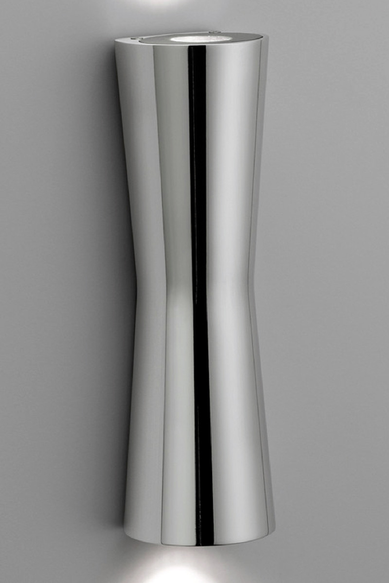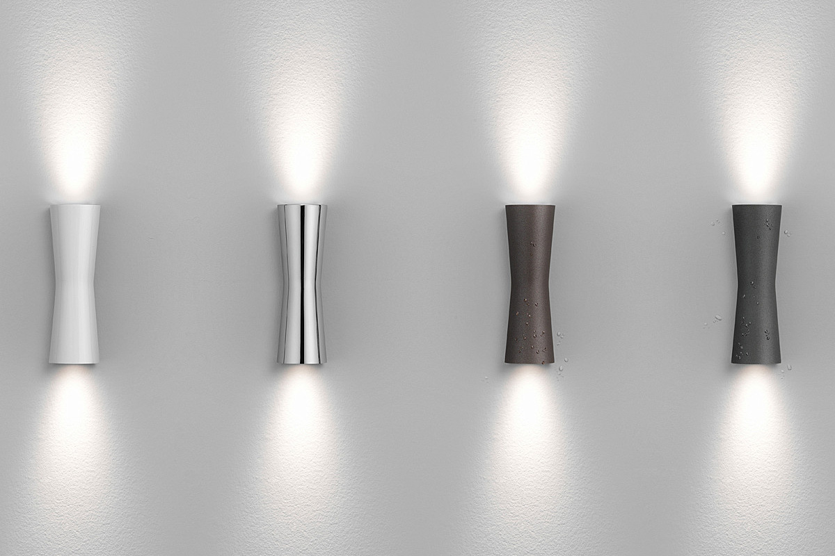 Elegantna stenska luč, ki po obliki spominja na peščeno uro oddaja ozek ali širok snop svetlobe usmerjen gor in dol. Na voljo tudi zunanja različica.