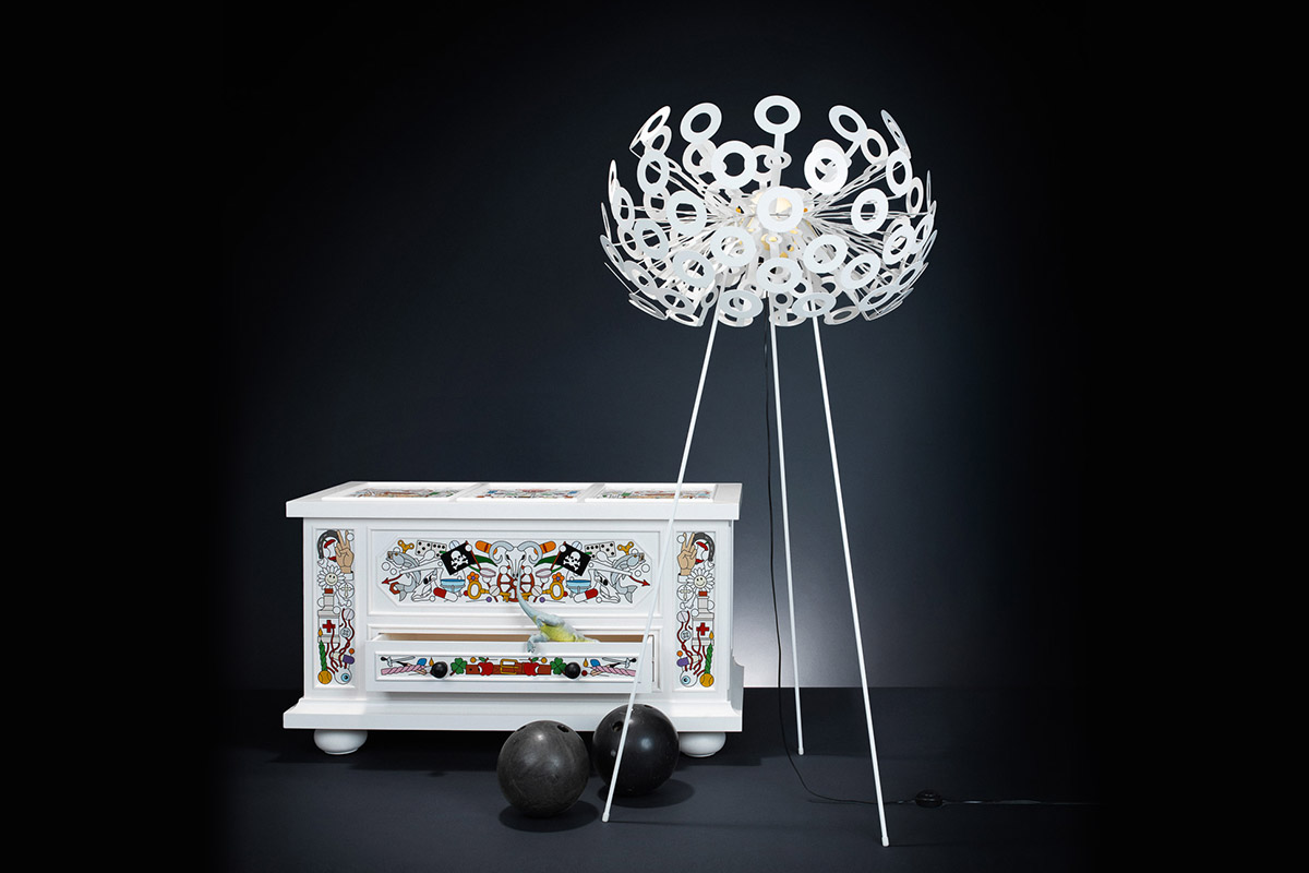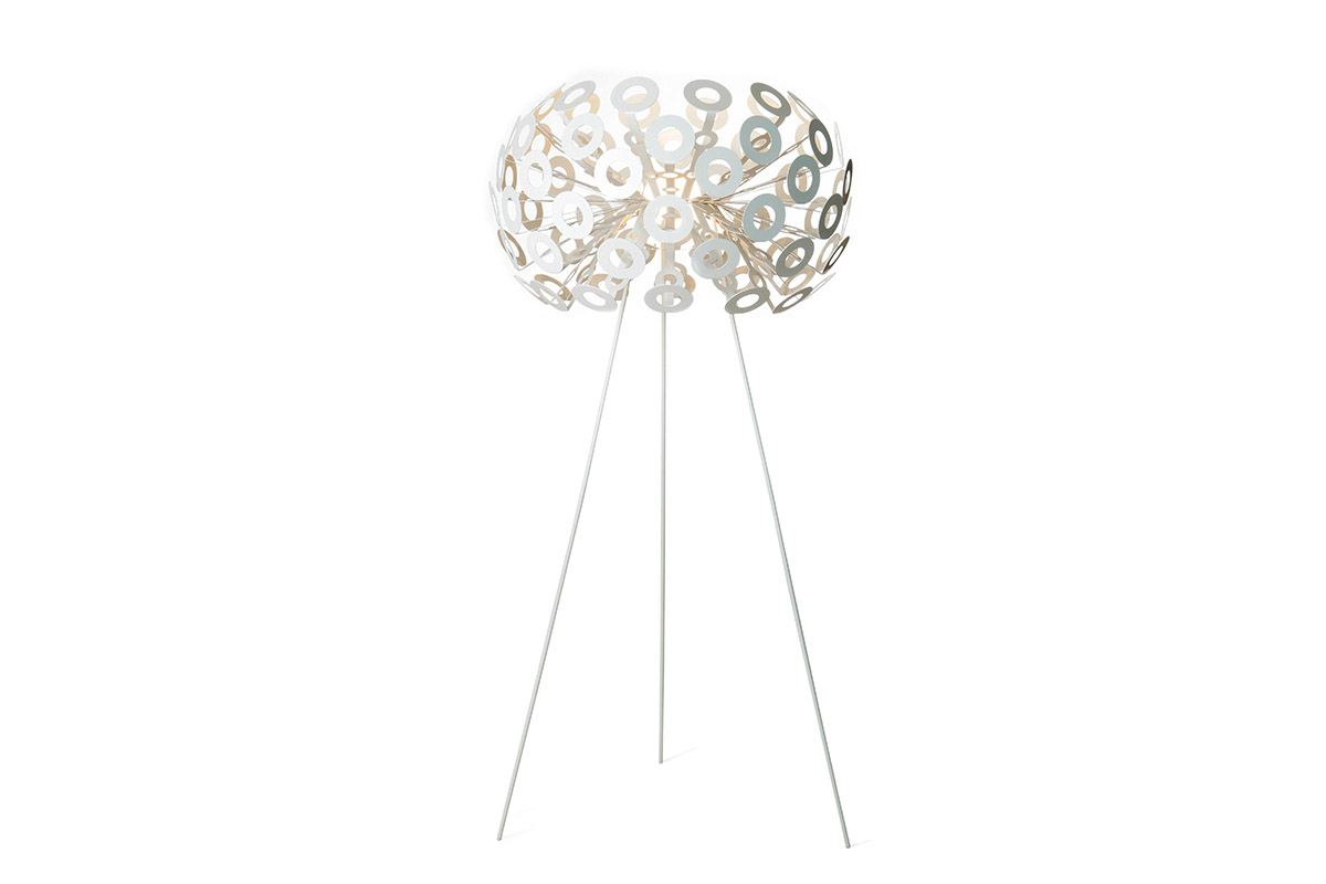 Talno svetilo inspirirano z regratovo lučko, dekorativno sveti v prostor in projecira nežne sence. Svetilo ima tudi družino viseče izvedbe.