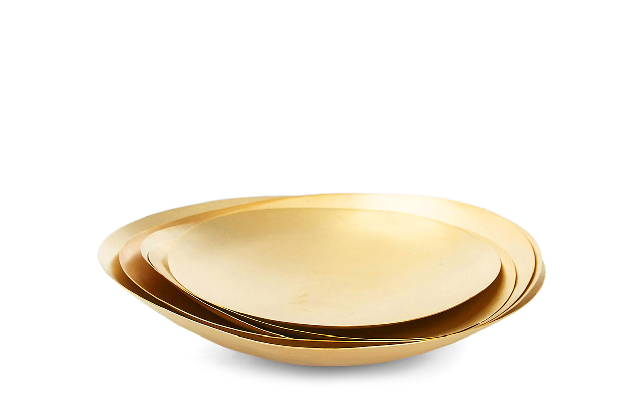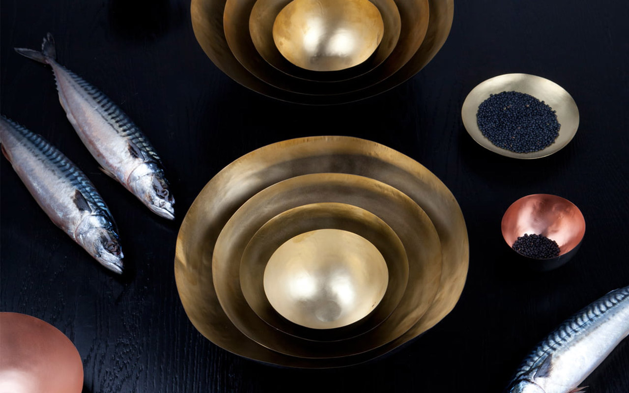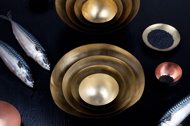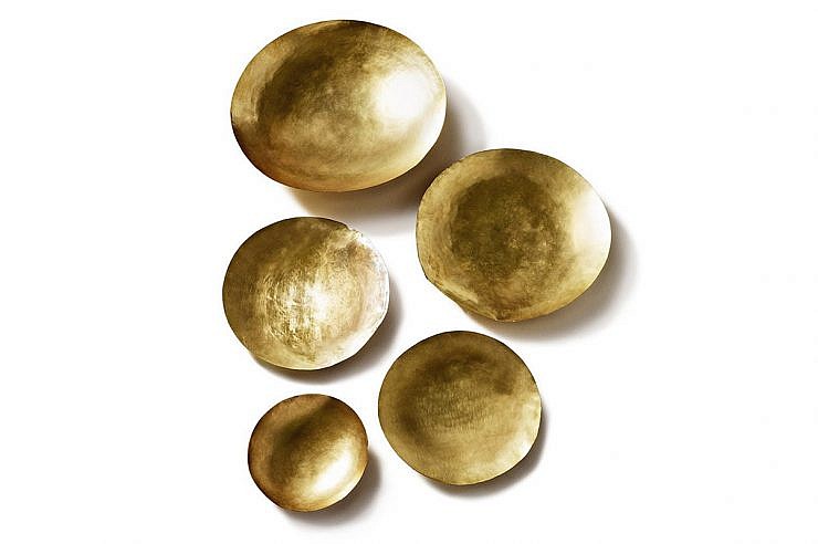 Pet delni set posod za serviranje prigrizkov iz neobdelane medenine, premera 27 cm - velika posoda. Uporaba samo za suho hrano.