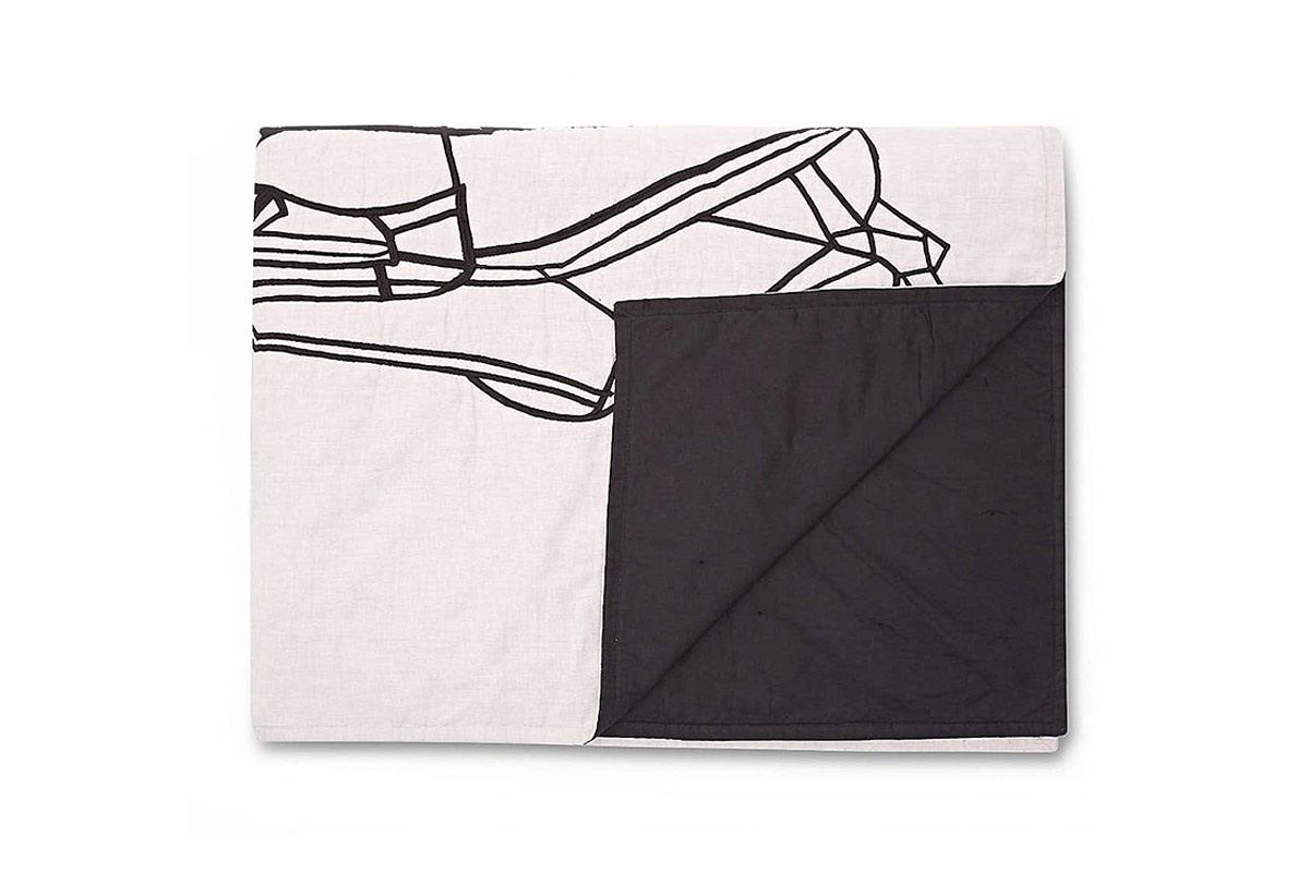 Črno bela grafična aplikacija na pregrinjalu. Dimenzije 130 x 200 cm. Sestava: 64% bombaž, 36% lan.