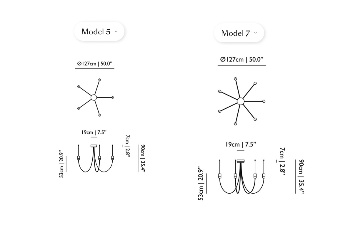 Gravitacijski lestenec je na voljo v dveh velikostih, po številu ročic, Gravity Lestencu 5 in Gravity Lestencu 7.