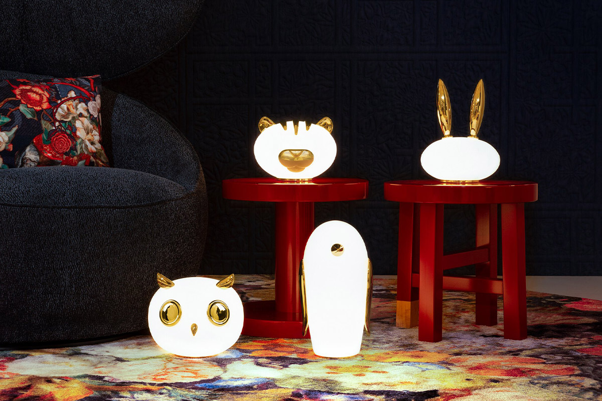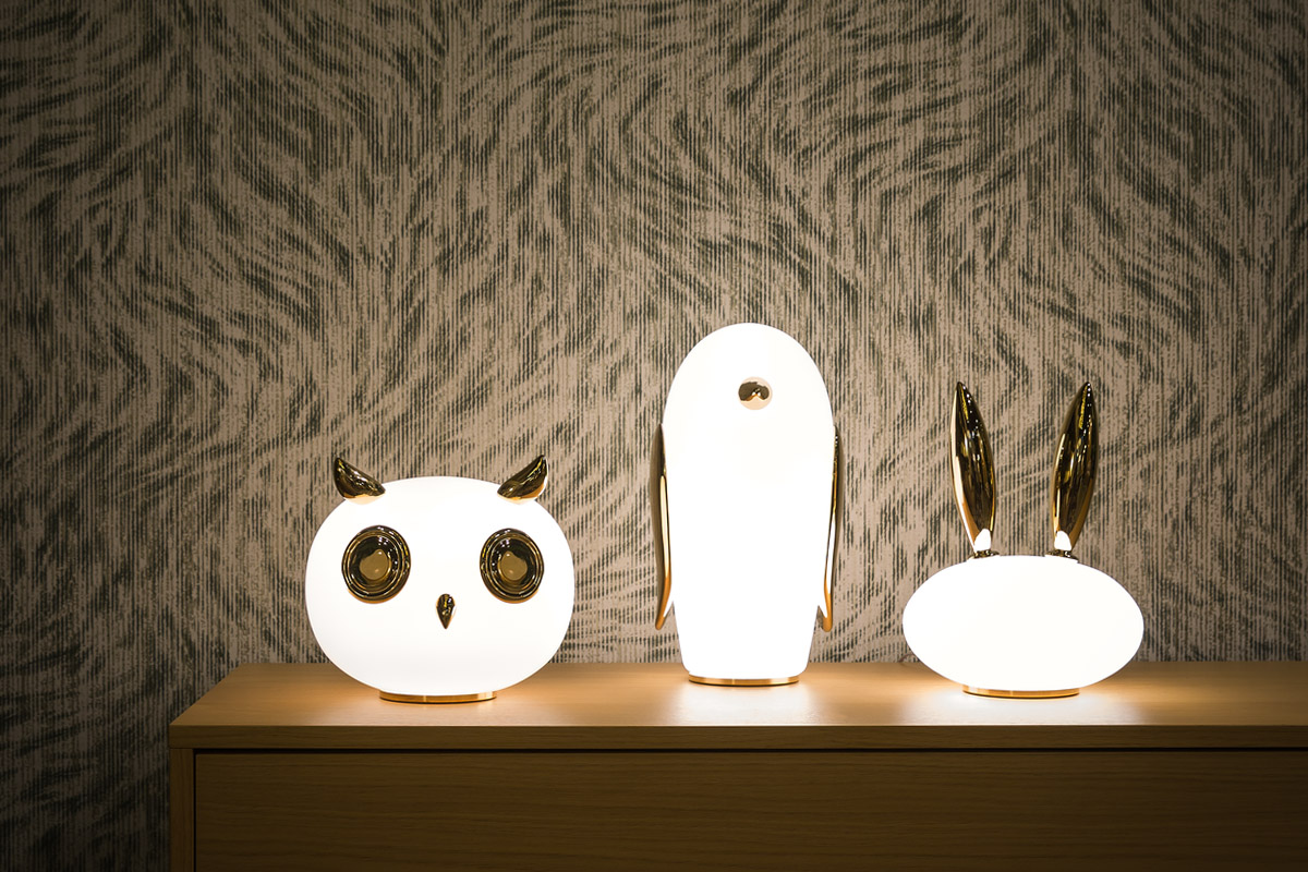 Uhuh, Purr, Noot Noot in Grwoww so serije namiznih svetilk Marcel Wanders Studio. Vsak hišni ljubljenček ima svojo osebnost in značilnosti. Te ljubke in elegantne luči najdejo svoje mesto v katerem koli prostoru. Z ohišjem iz matiranega stekla in z elementi keramičnega zlata oddajajo topel sijaj, ki ga lahko poljubno zatemnite.