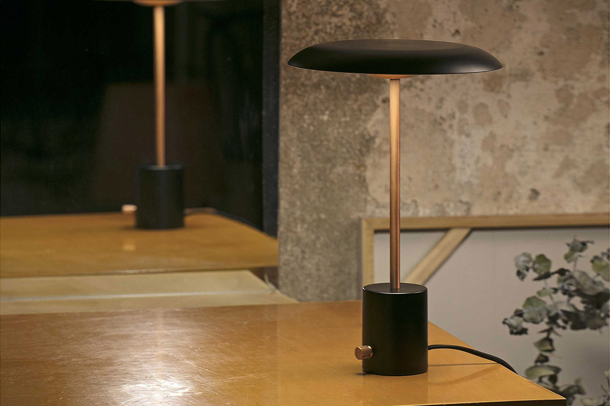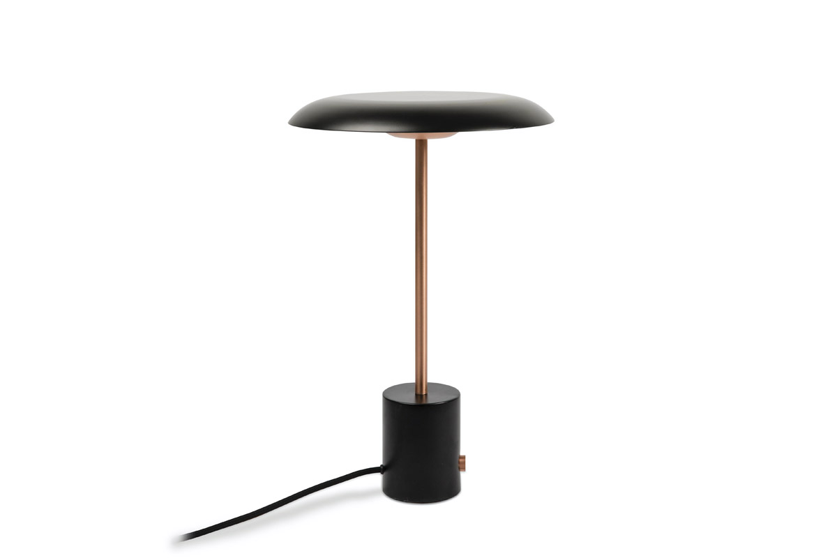 Namizno dekorativno svetilo z zasenčeno svetlobo. Črno-bakrena izvedba.