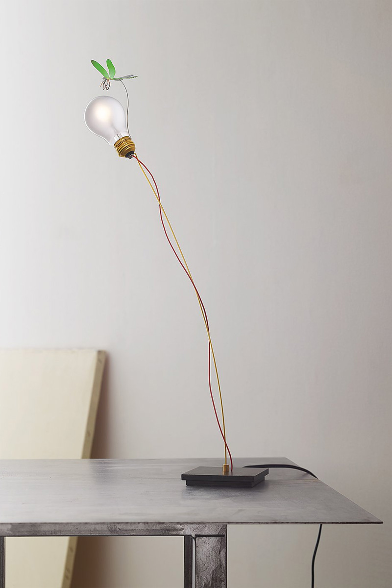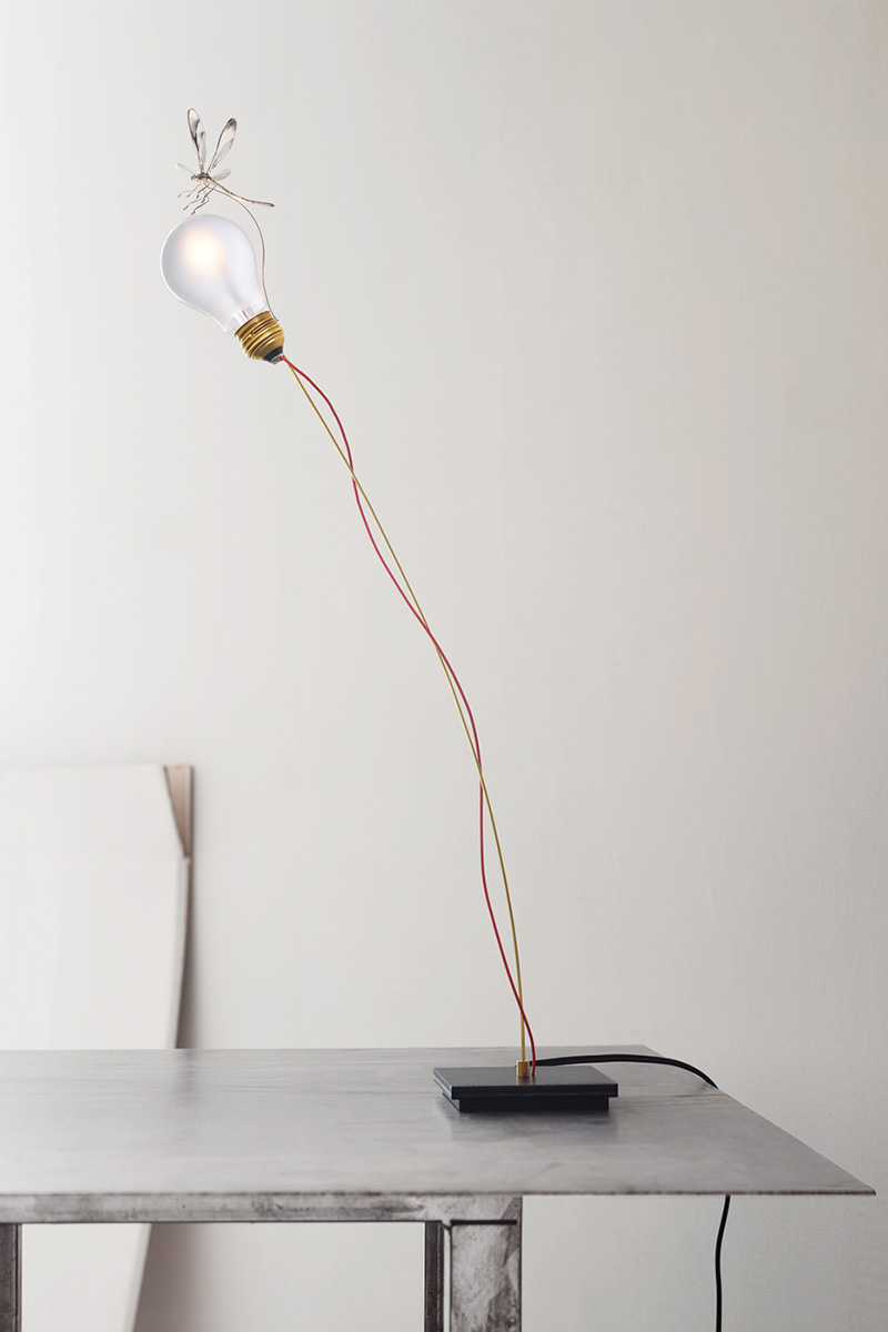 Duhovita namizna luč ali še ena umetniška zamisel Ingo Maurerja. Protagonist namizne svetilke je ročno izdelan aluminjast kačji pastir, ki počiva na žarnici. Vitko medeninasto steblo povezuje žarnico s čvrsto jekleno podlago, rdeče obarvan elktrični kabel pa doda piko na i. I Ricchi Poveri Bzzzz nudi možnost zatemnitve svetlobe, možnost, da ustvarimo še bolj čarobno vzdušje z duhovito osebnostjo.