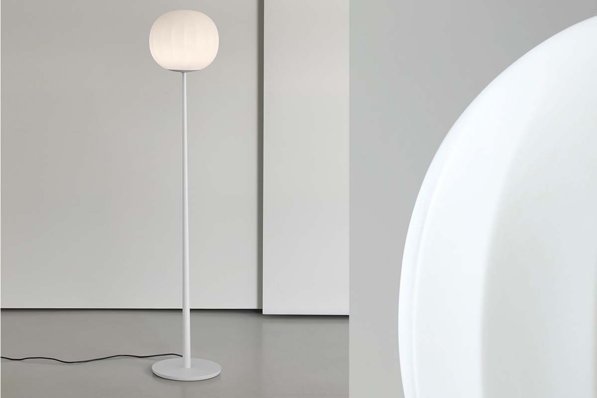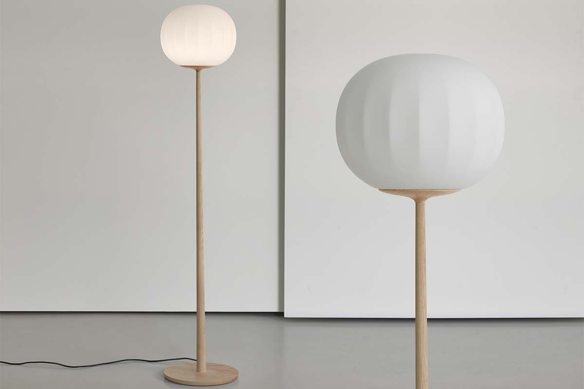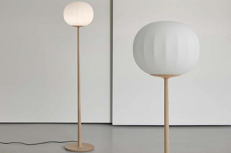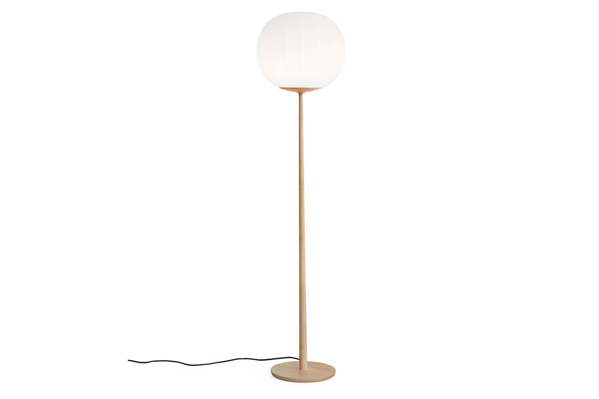 Difuzor iz opalinskega pihanega stekla, katerega površina se podaljšuje s ponavljanjem rahlih navpičnih vrhov je v kombinaciji z leseno konstrukcijo, izdelek z močnim materialnim značajem.