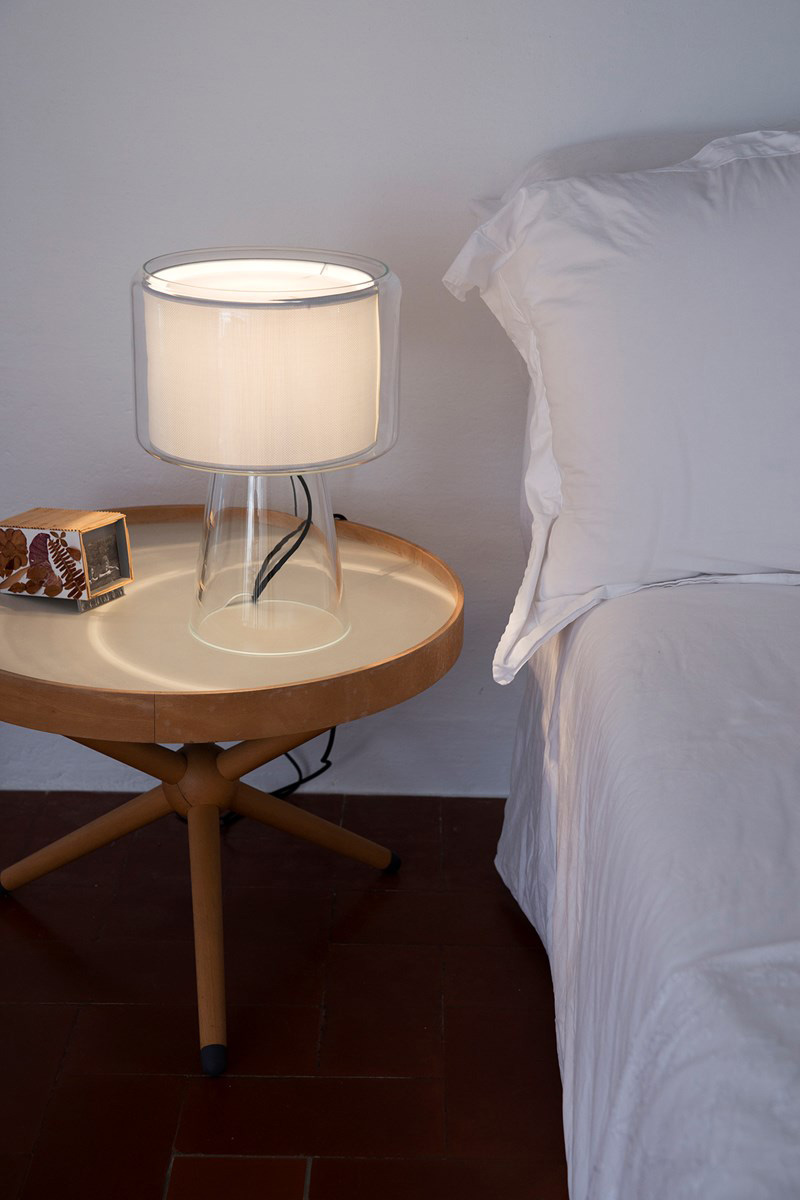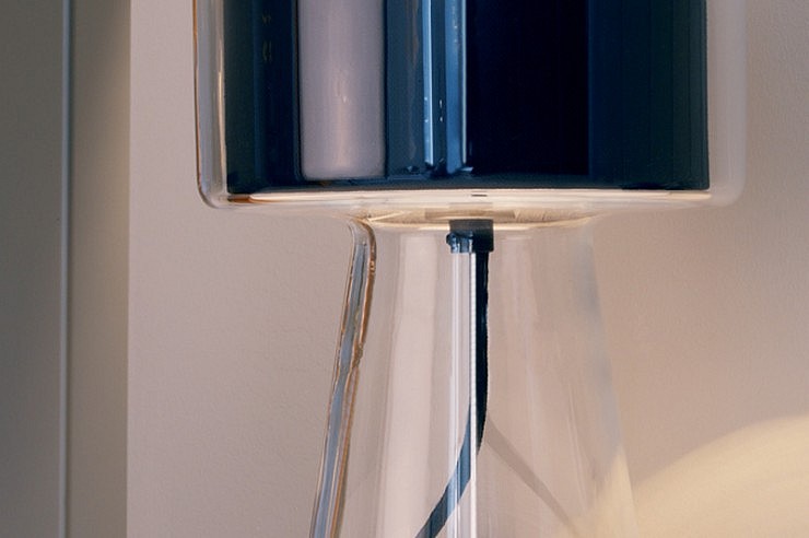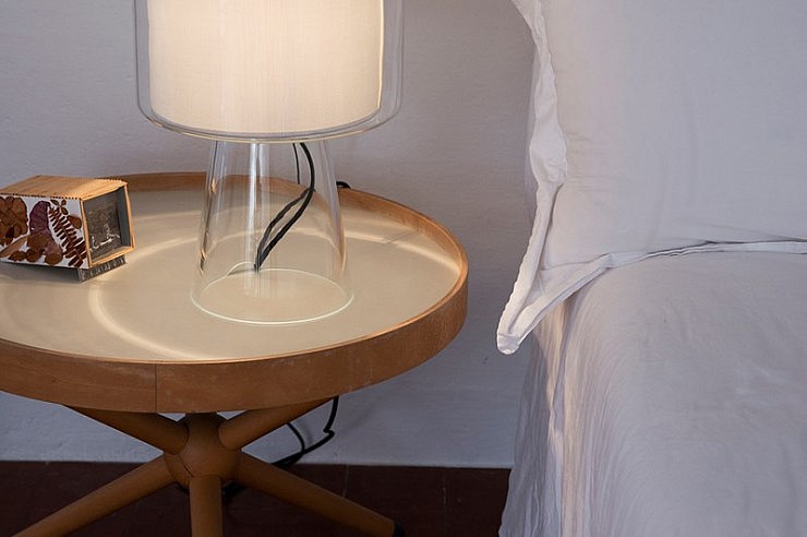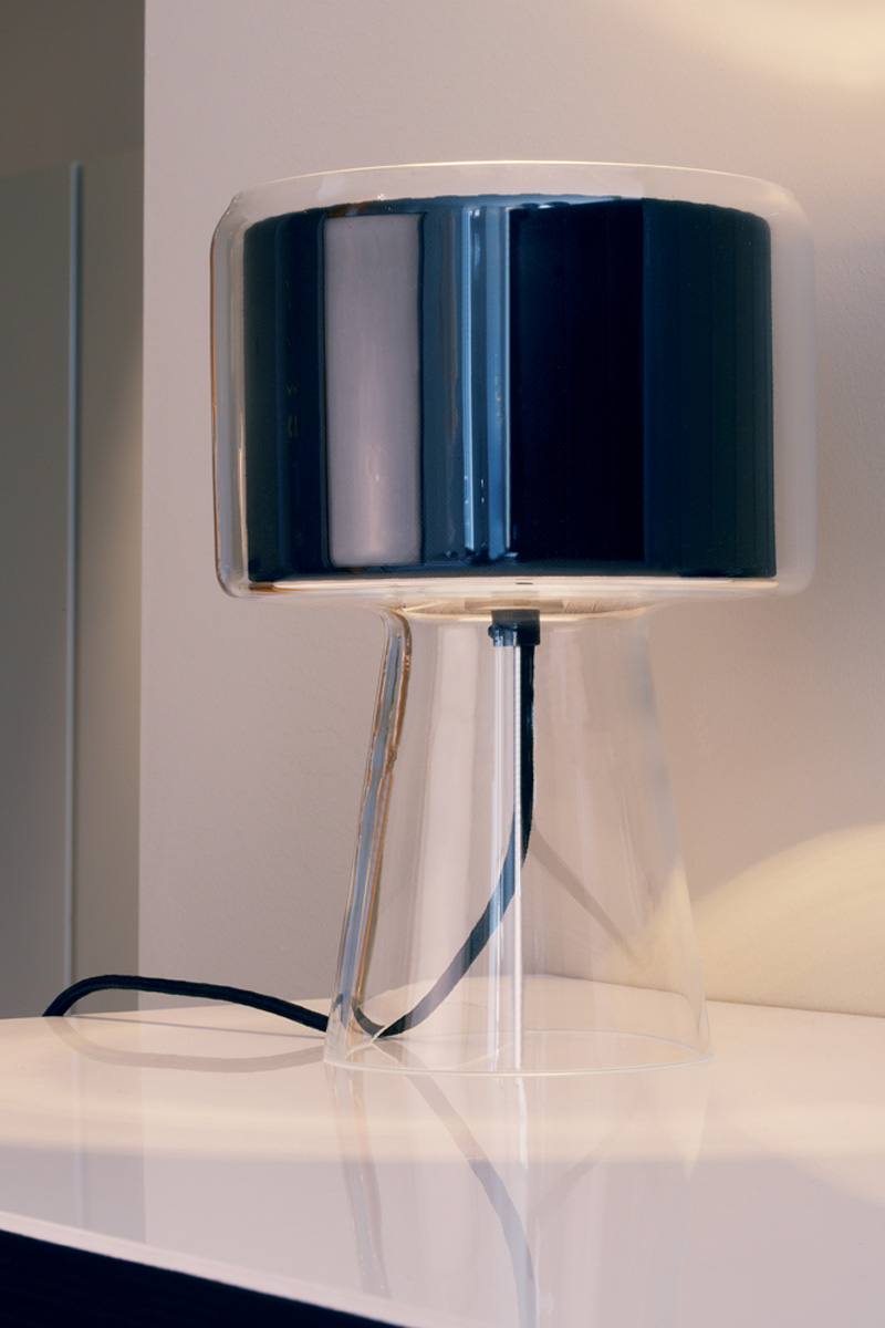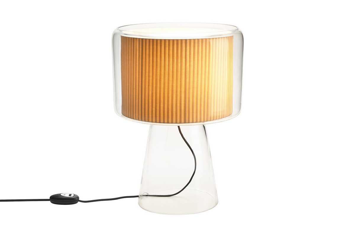 Namizno svetilo, k i z kombinacijo različnih materialov doseže zanimiv efekt v prostoru.