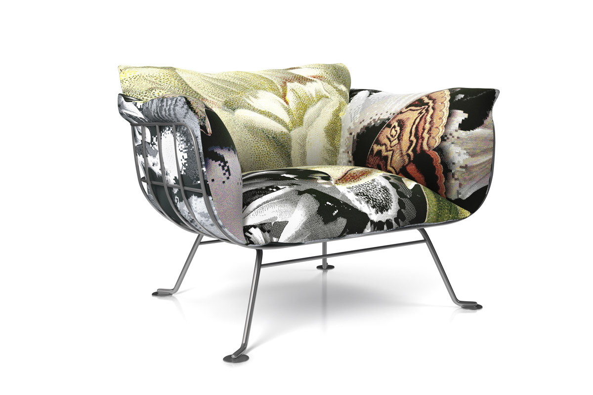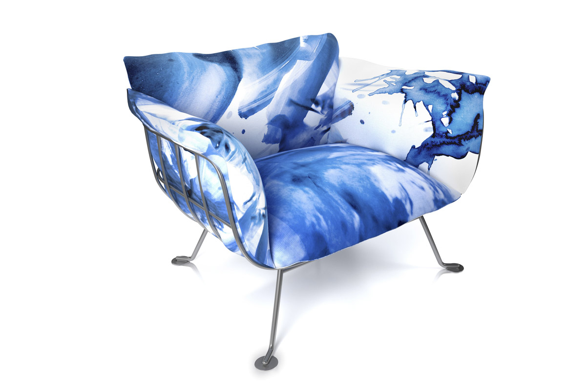 Udoben oblazinjen stol s kovinsko konstukcijo v barvnih vzorcih.