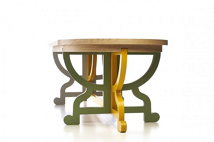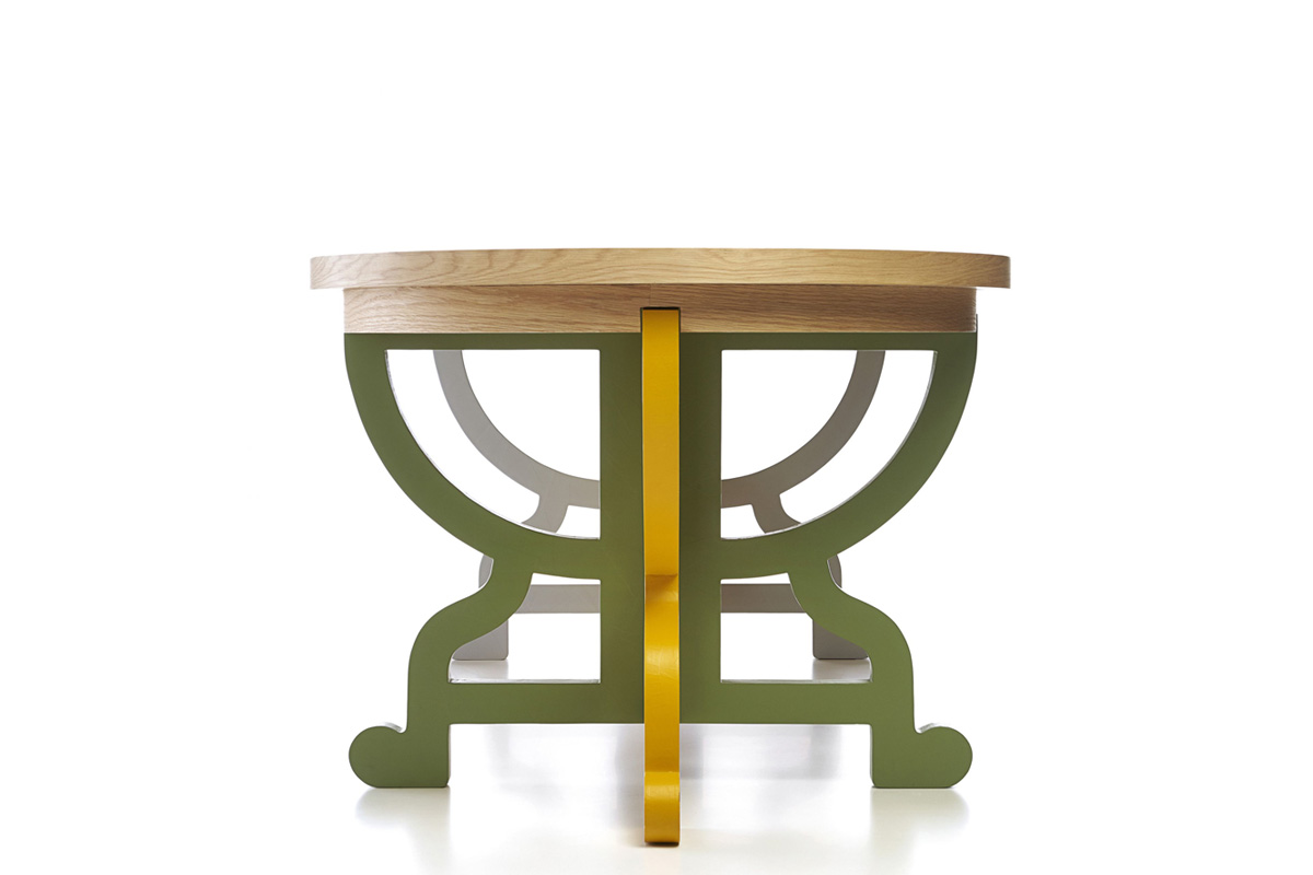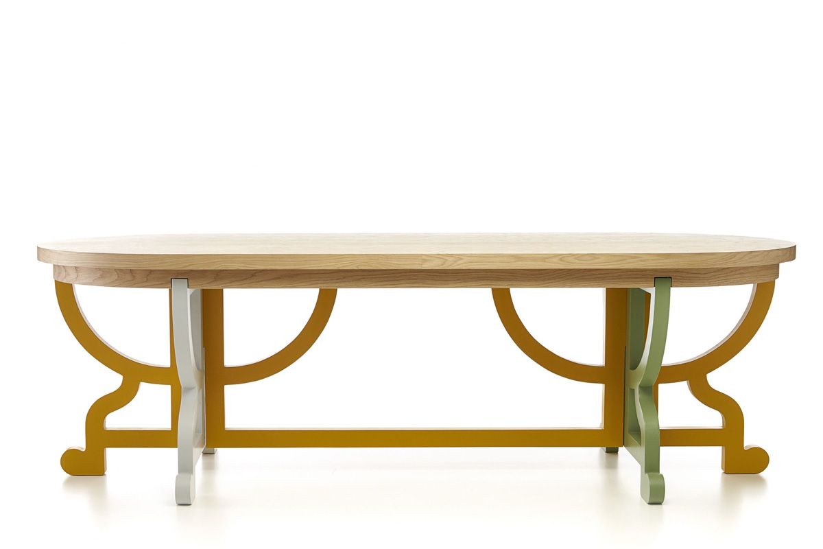 Jedilna miza iz serije Paper. Možnost različnih barvnih kombinacij, plošča izdelana iz hrastovega furnirja.