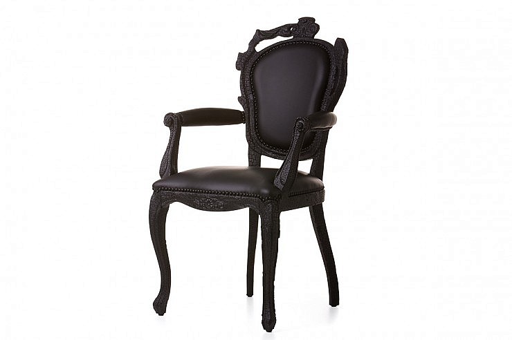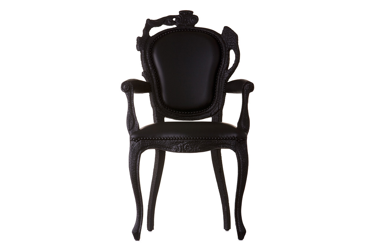 Usnjen stol z naslonjalom za roke oblikovalca Maarten Baasa s svojo zanimivo zgodbo o nastanku je postal ikona podjetja Moooi. Vsak stol se individualno polije s črno smolo in zažge. S tem postane vsak Smoke Chair unikaten v obliki.