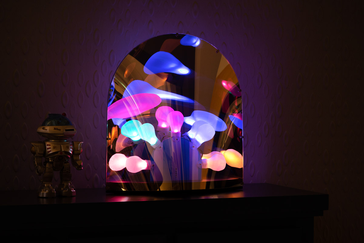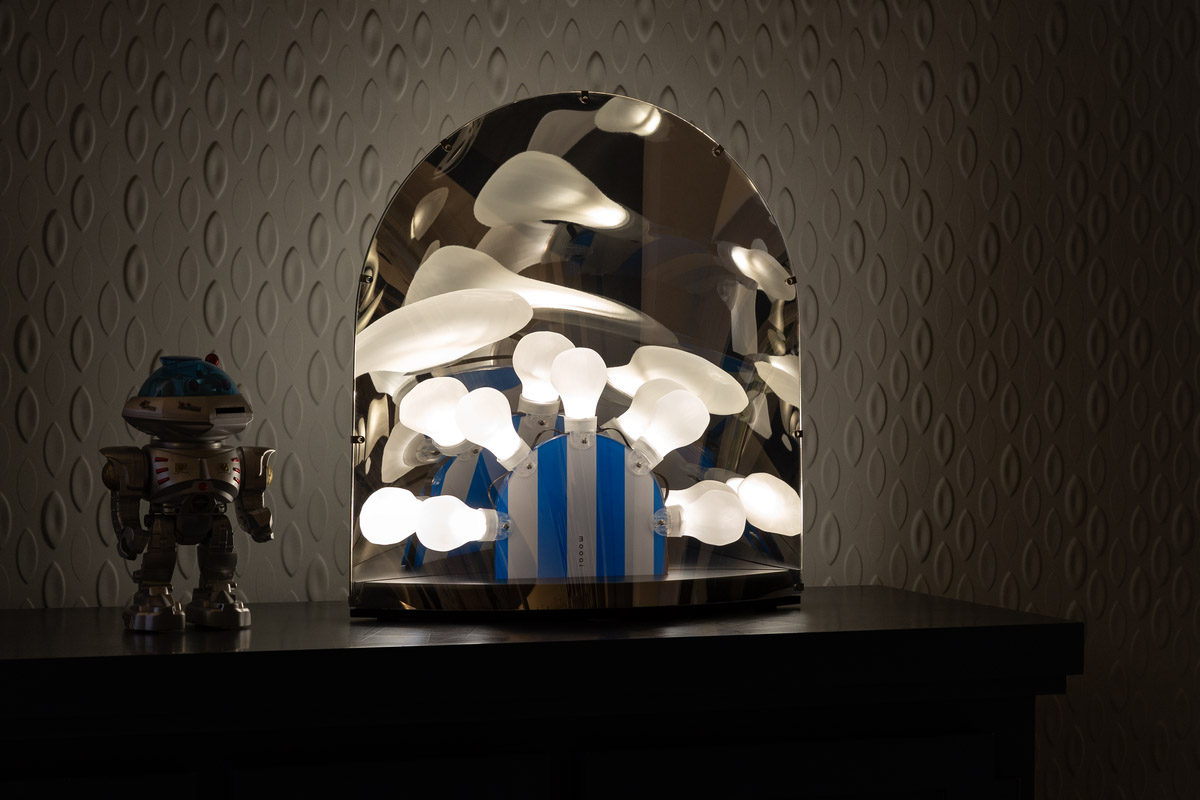 Je ogledalo? Je svetilka? Je to disko? Da, vse je in še več! Nedotaknjena svetilka odraža njeno okolico, ogledalo pa bo ob vklopu postalo prosojno. Svetilka ima štiri različne nastavitve svetlobe in ima inovativno možnost Dim-To-Disco.