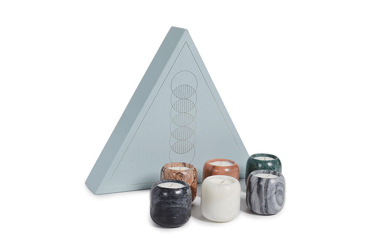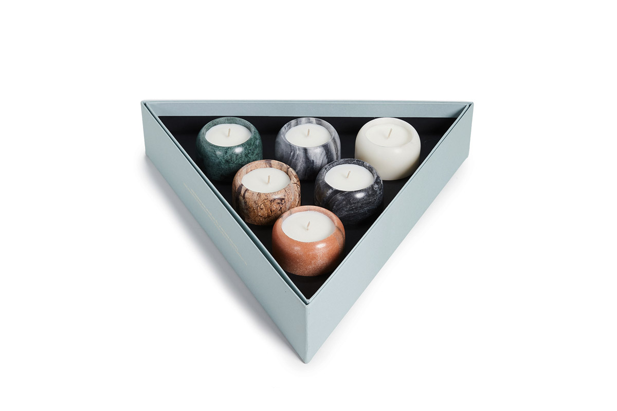 Set 6-ih dišečih sveč različnih marmornih podstavkih z vonjem fig in sandalovine. Marmor, soja in parafinski vosek. Primerno tudi, kot darilo v lepo oblikovani embalaži. Dimenzije 9,5x42x42 cm.