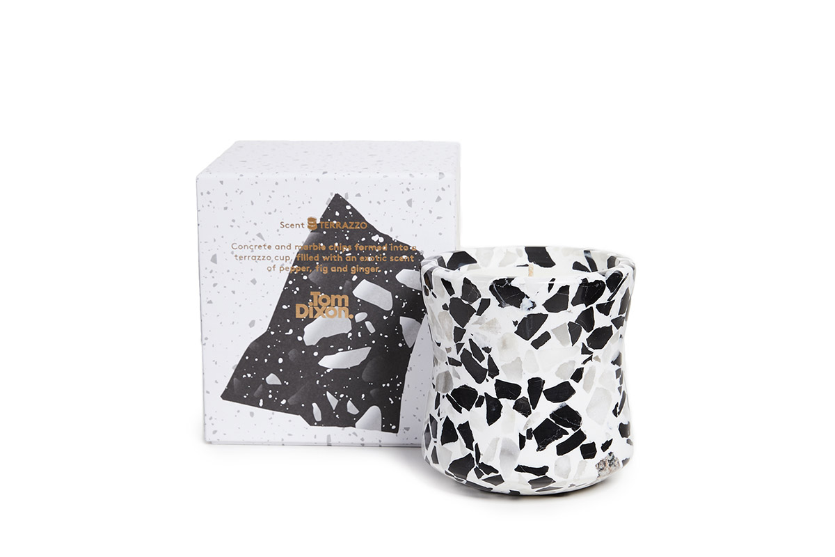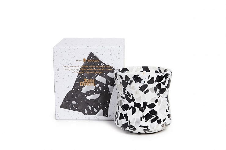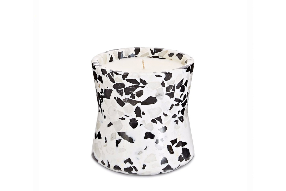Dišeča sveča. Kamen, soja in parafinski vosek. Primerno tudi, kot darilo v lepo oblikovani embalaži. Dimenzije 9,5x9,5x9,5 cm.