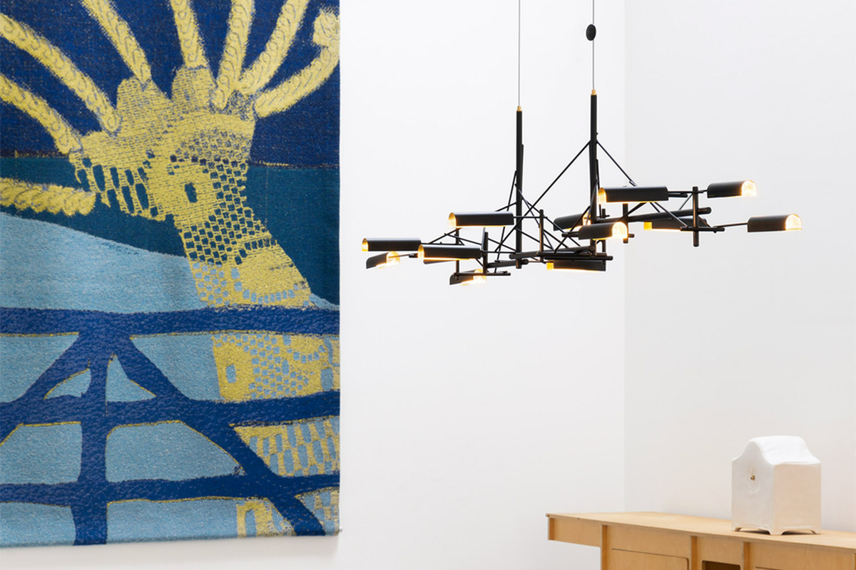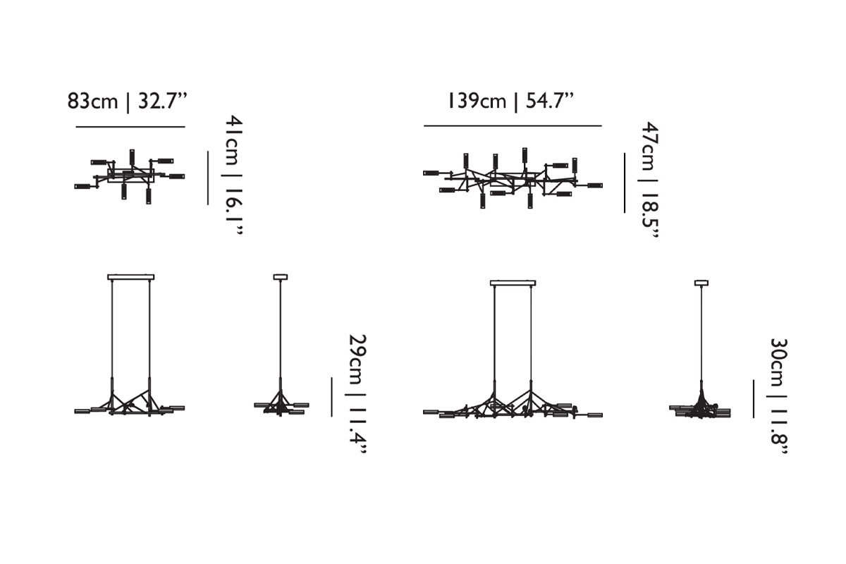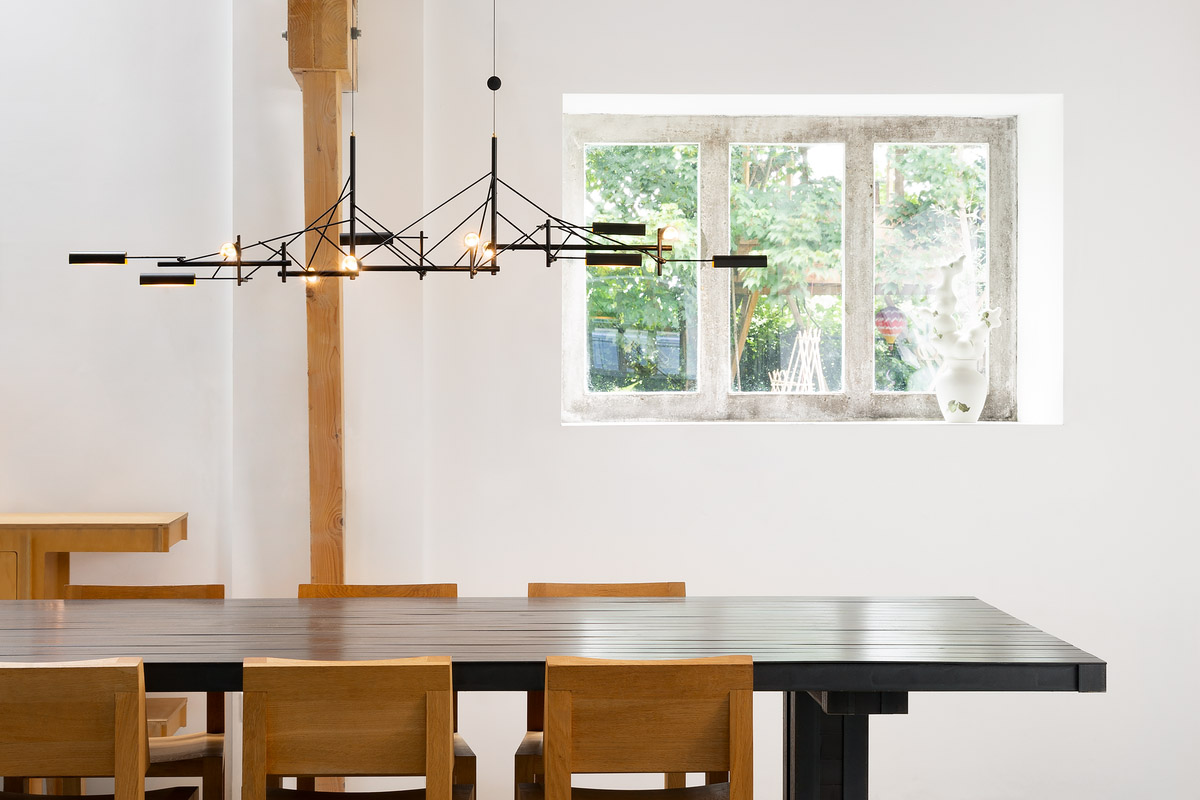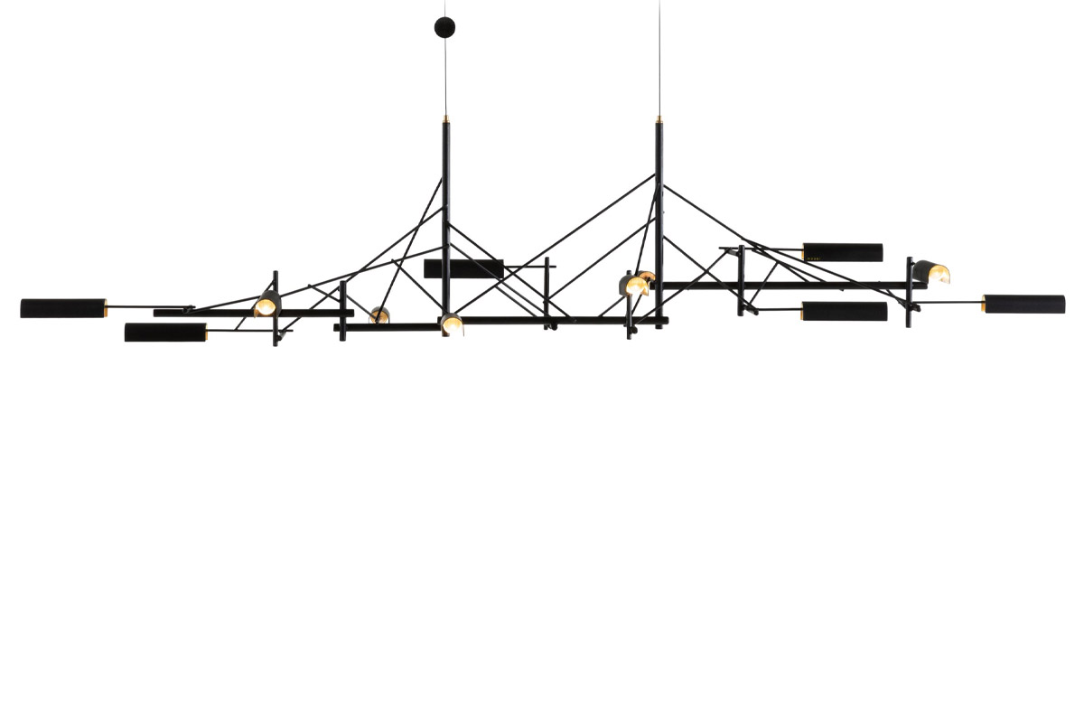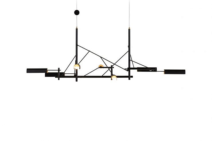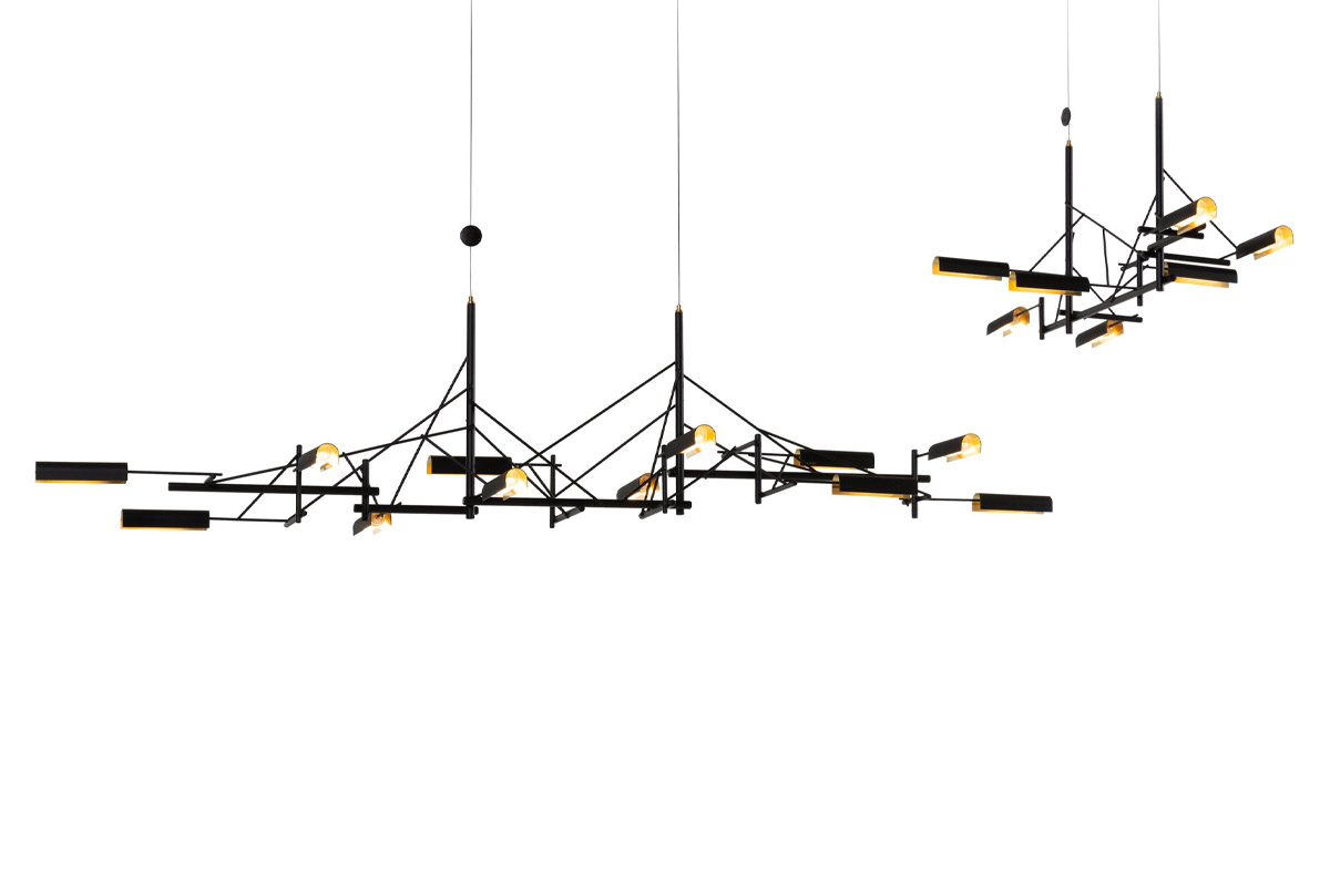 Svetilo očara z ritmično kompozicijo iz nerjavečega jekla in medenine s črno prevleko. Svetlobne kape so individualno nastavljive.