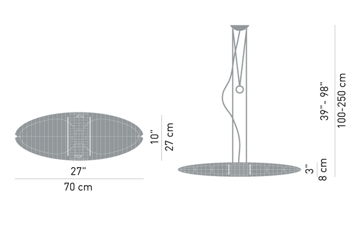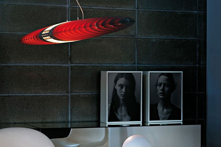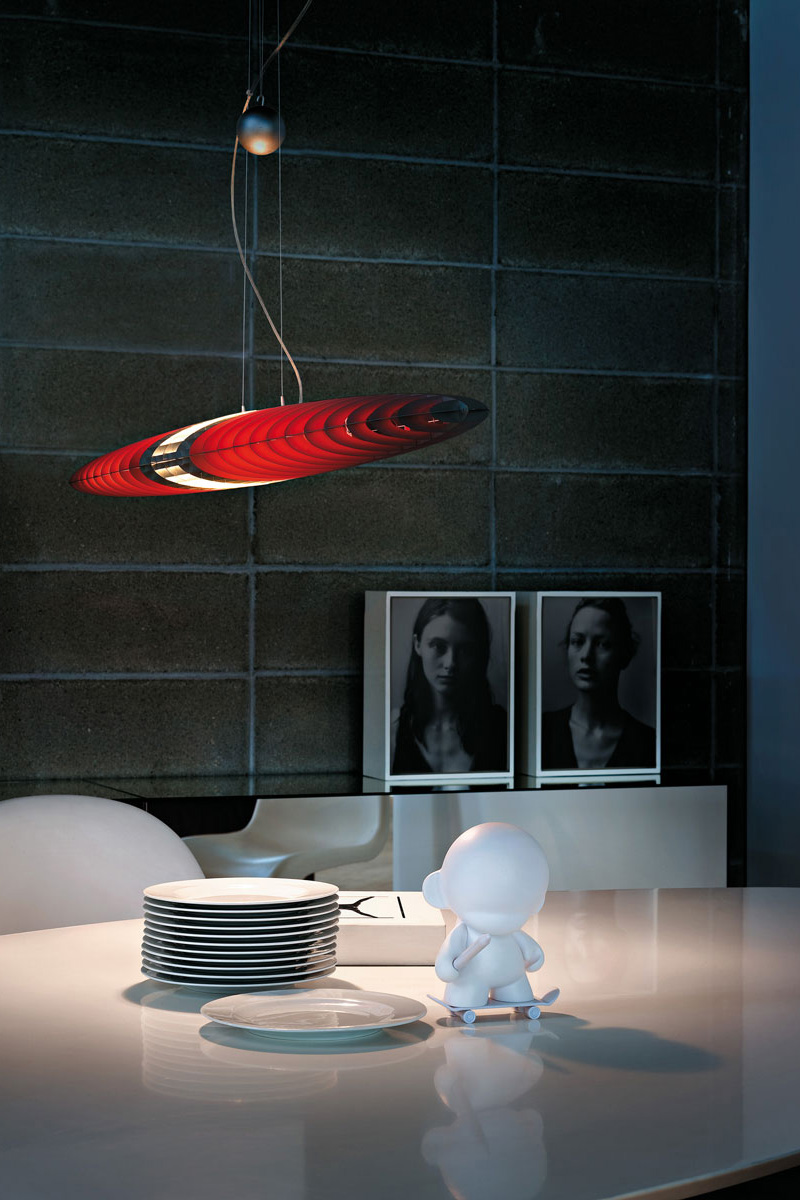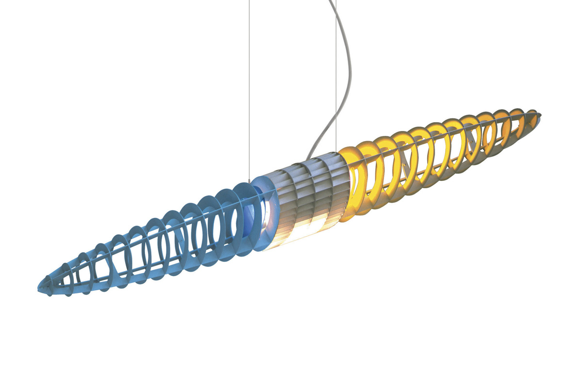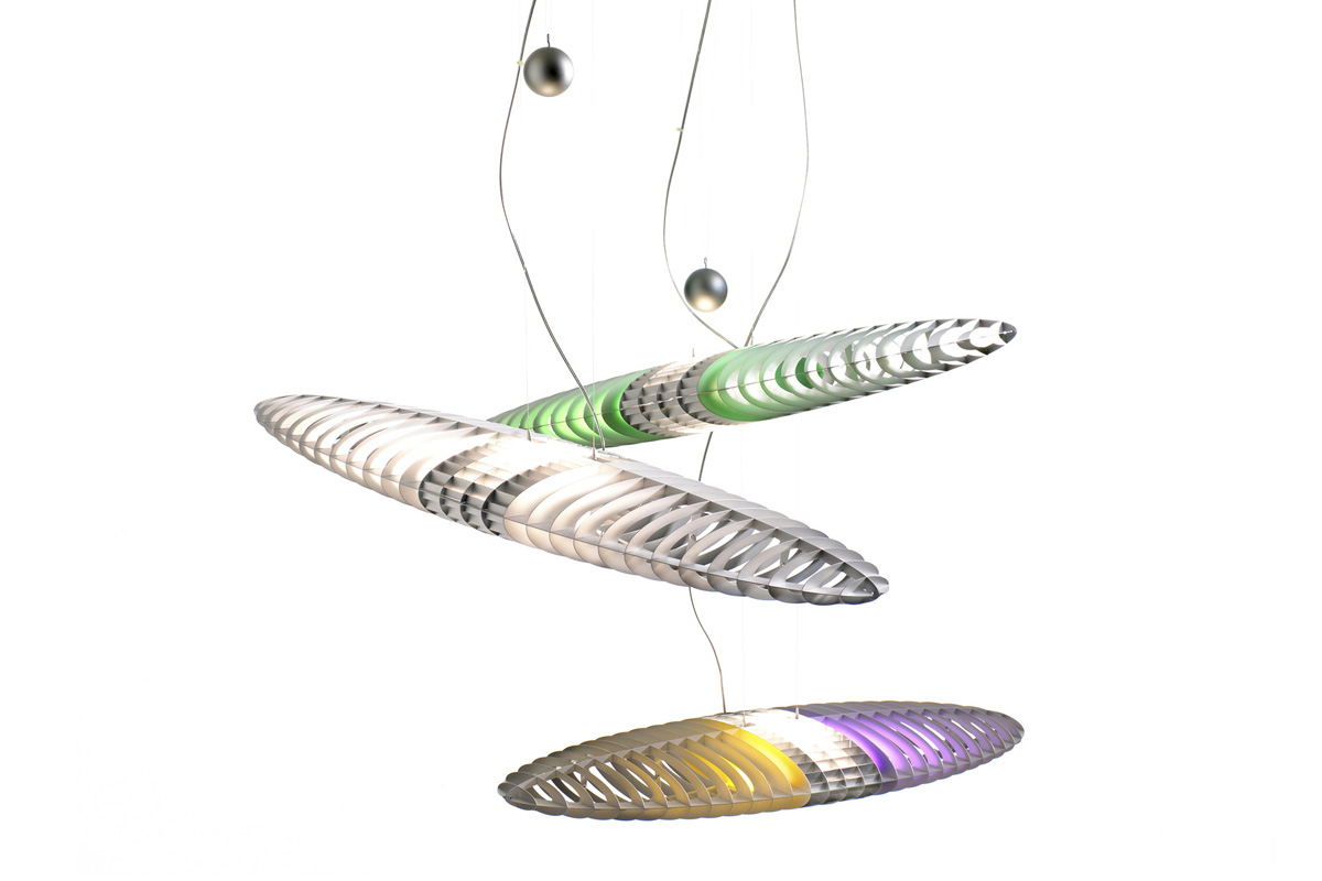 Viseče svetilo posebne oblike rebrastih aluminijskih lamel z možnostjo menjave barvnih filtrov: viojoličast, moder, rumen, rdeč in zelen. Nastavljivo poljubno po višini. Možnost regulacije na stikalu.