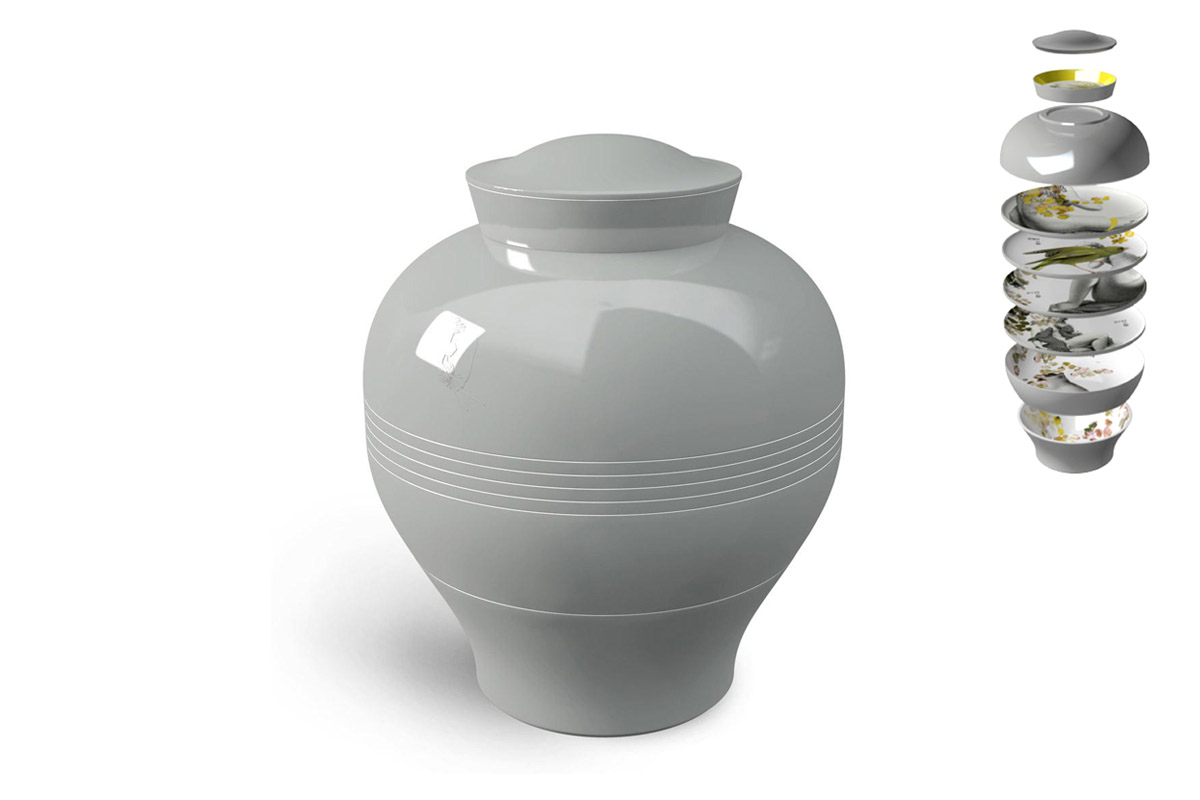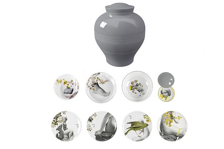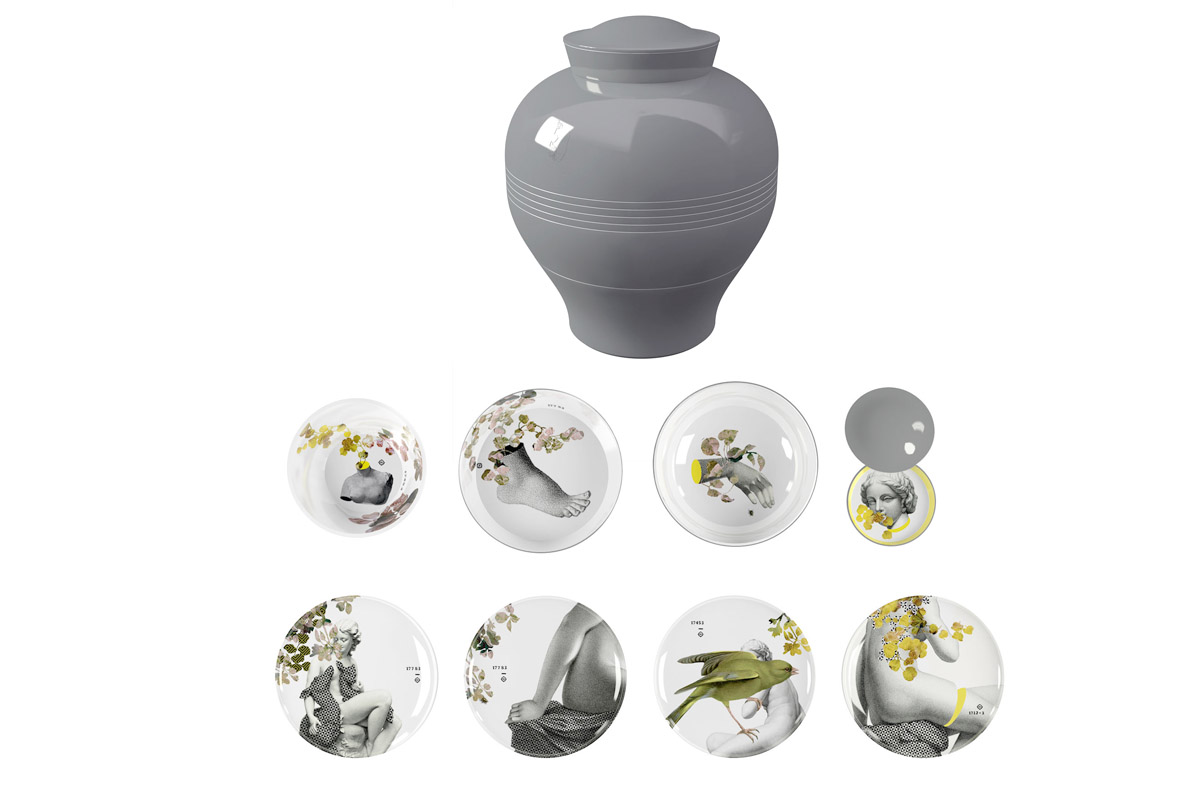 Posoda Yuan Parnasse je narejena iz melamina in je na zunanji strani siva. Set za zlaganje je sestavljen iz 4 krožnikov (Ø 25 cm), 1 sklede za solato (Ø 25 cm x V 8 cm), 1 sklede (Ø 21 cm x H 8 cm), 1 posode (Ø 25 cm x H 6 cm), 1 manjši lonec s pokrovom ali posodico za sladkor (Ø 13,5 cm x H 3 cm). Vsak kos je ilustriran z nostalgičnimi pričevanji in pisanimi pravljicami, ki so v stiku z našo domišljijo. Ko je zložen, komplet posode dobi obliko vaze.